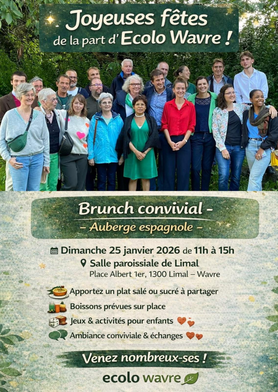 Rejoignez-nous le 25 janvier pour un brunch convivial ( auberge espagnole) à la salle paroissiale de Limal de 11h à 15h. Place Albert Ier.